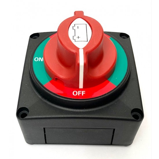 Marine battery isolator switch with fixed control knob. 550A rated @ 48Vdc and 2500A for 5 seconds. M12 studs.