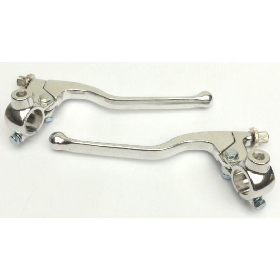 Alloy lever pair, complete with cable adjusters and mirror boss. Use nipple BN89L (8mm x 9mm) and ferrule F100. Suitable for 7/8" bars